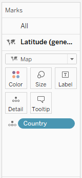 - For the first Marks card, set the mark type to Map and drag-and-drop Country into Detail. Set Color to #b4b4b4 with 40% opacity.