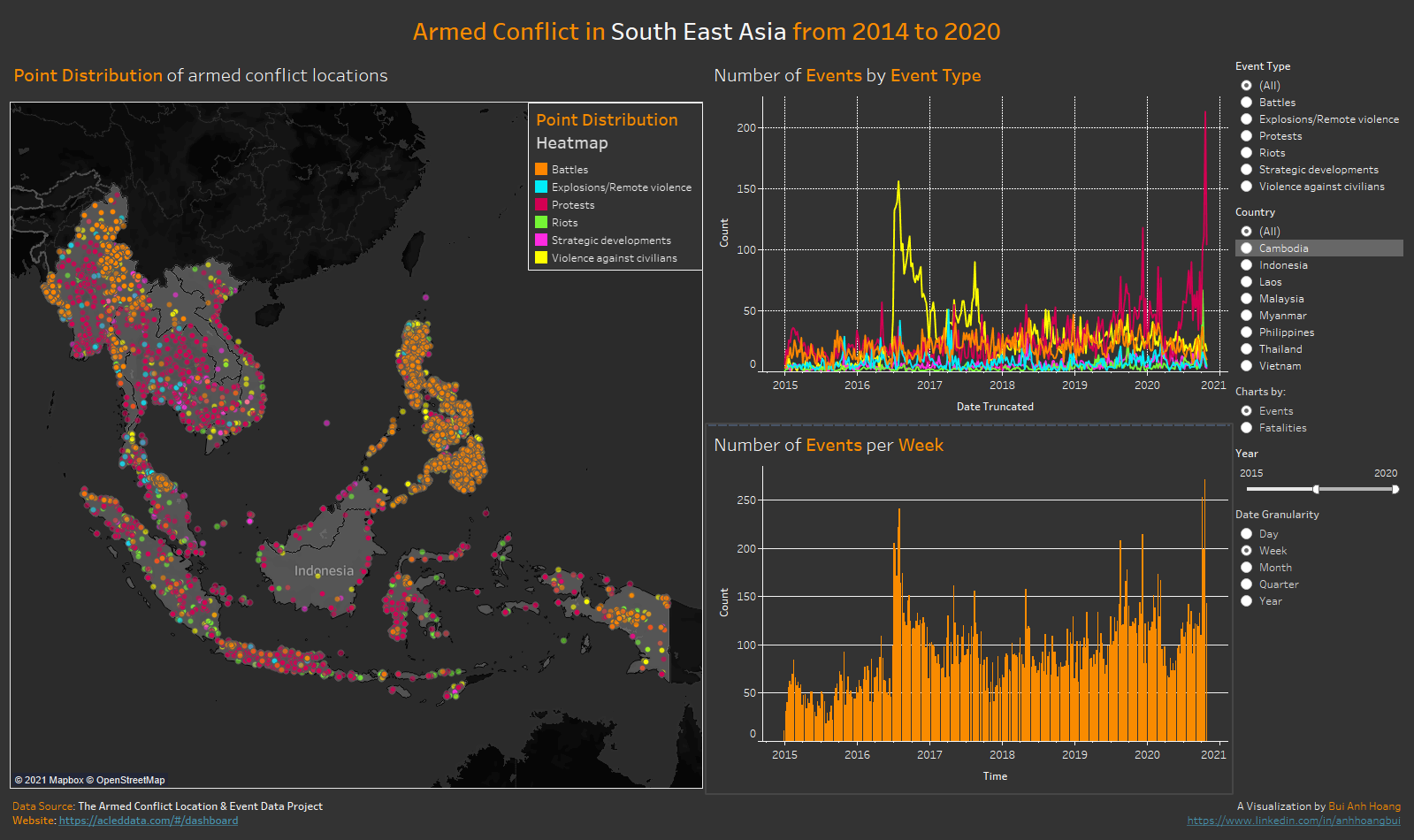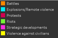 The scale of the Y-axis of the line charts are not synchronized, which can lead to misinterpretation when comparing the number of events. For example, on first glance, it would seem like in 2020, there are more Explosions events compare to Battles but it is in fact the other way around |