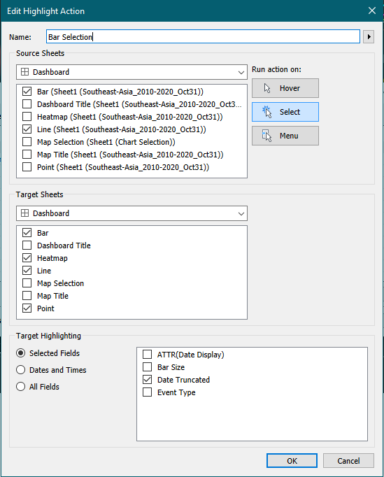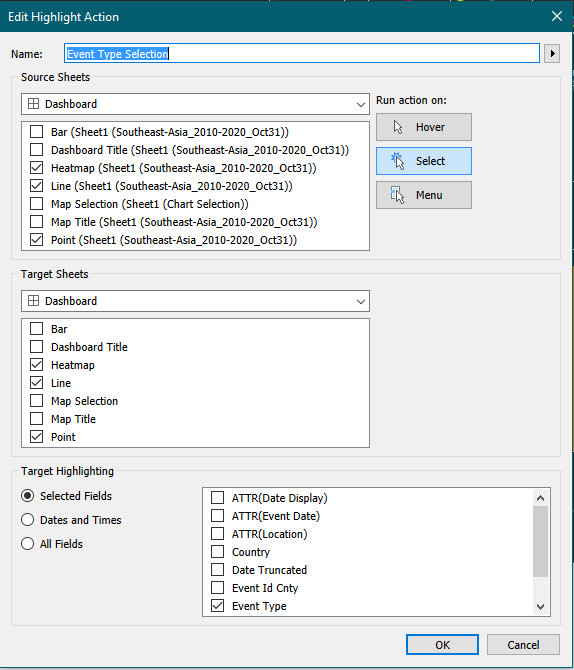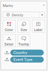 Add Country, Event Type and Event Date (by Year) to the Filters card. Right-click on each one of them and select Apply to Worksheets > All Using This Data Source.