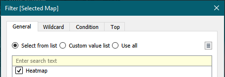 - Add the Selected Map attribute into the Filters card and select the Heatmap checkbox in the filter dialogue.
