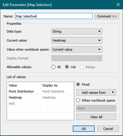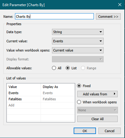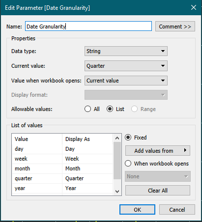- Create a new Parameter called Date Granularity with the following properties. Note: the values on the left column need to be in lower case.