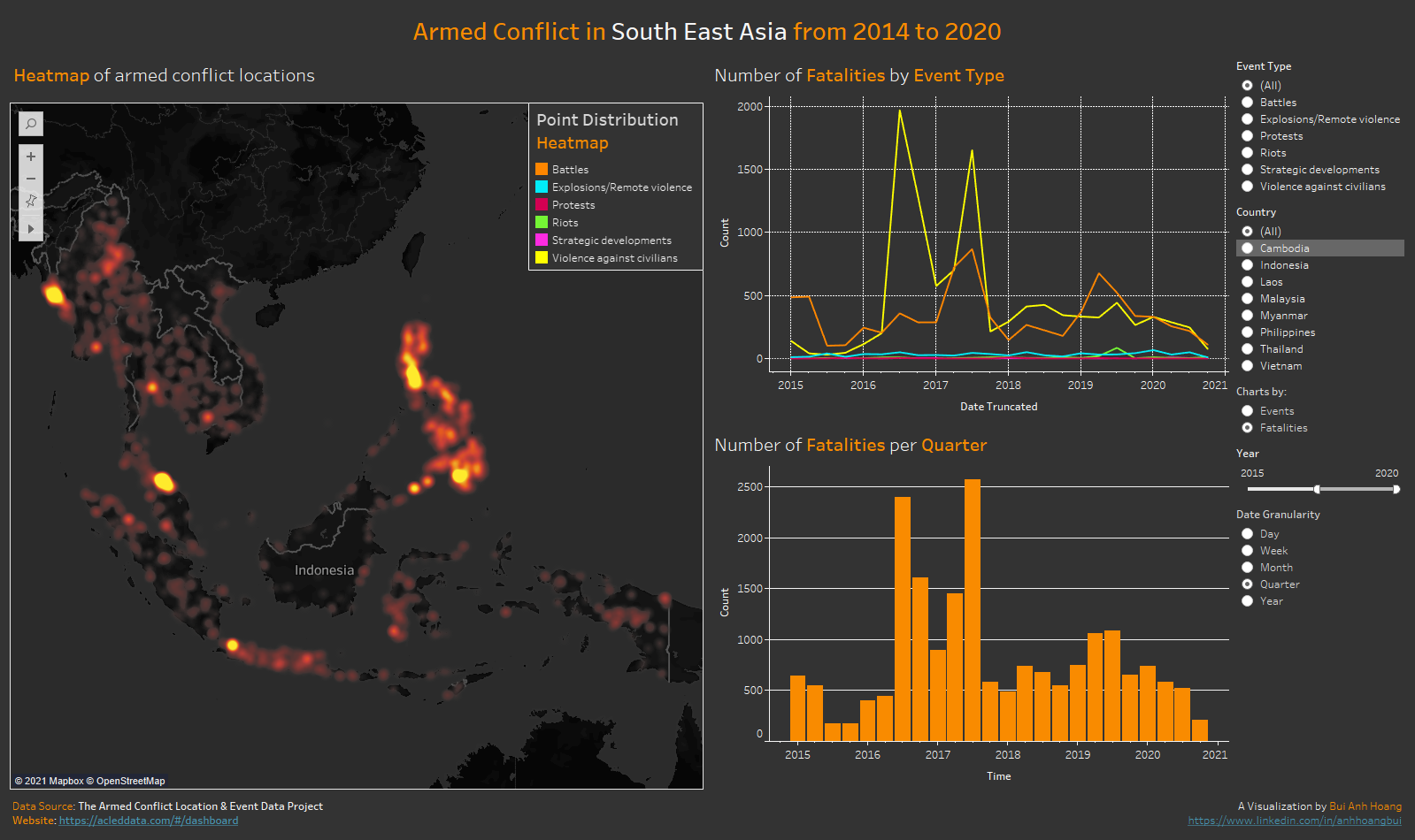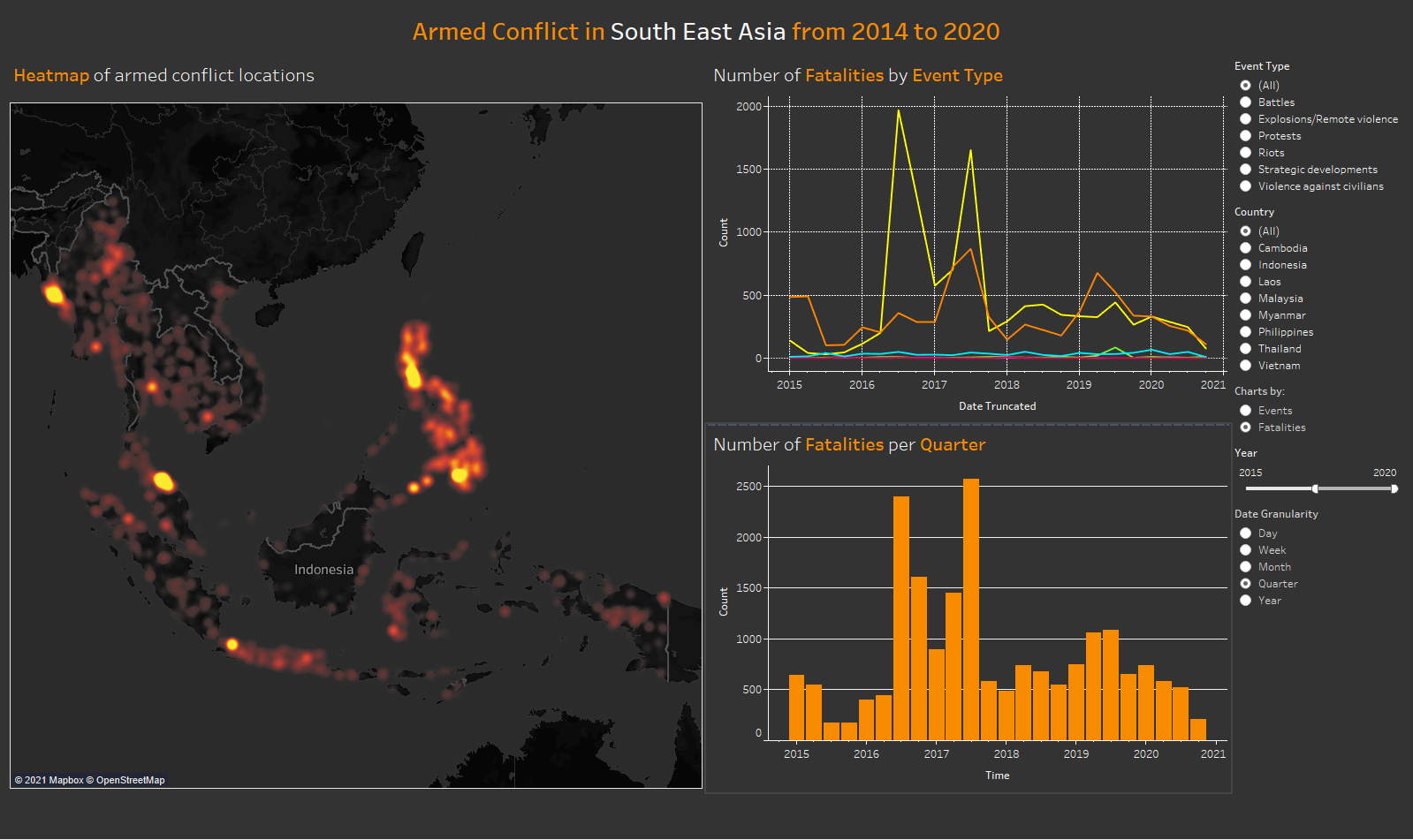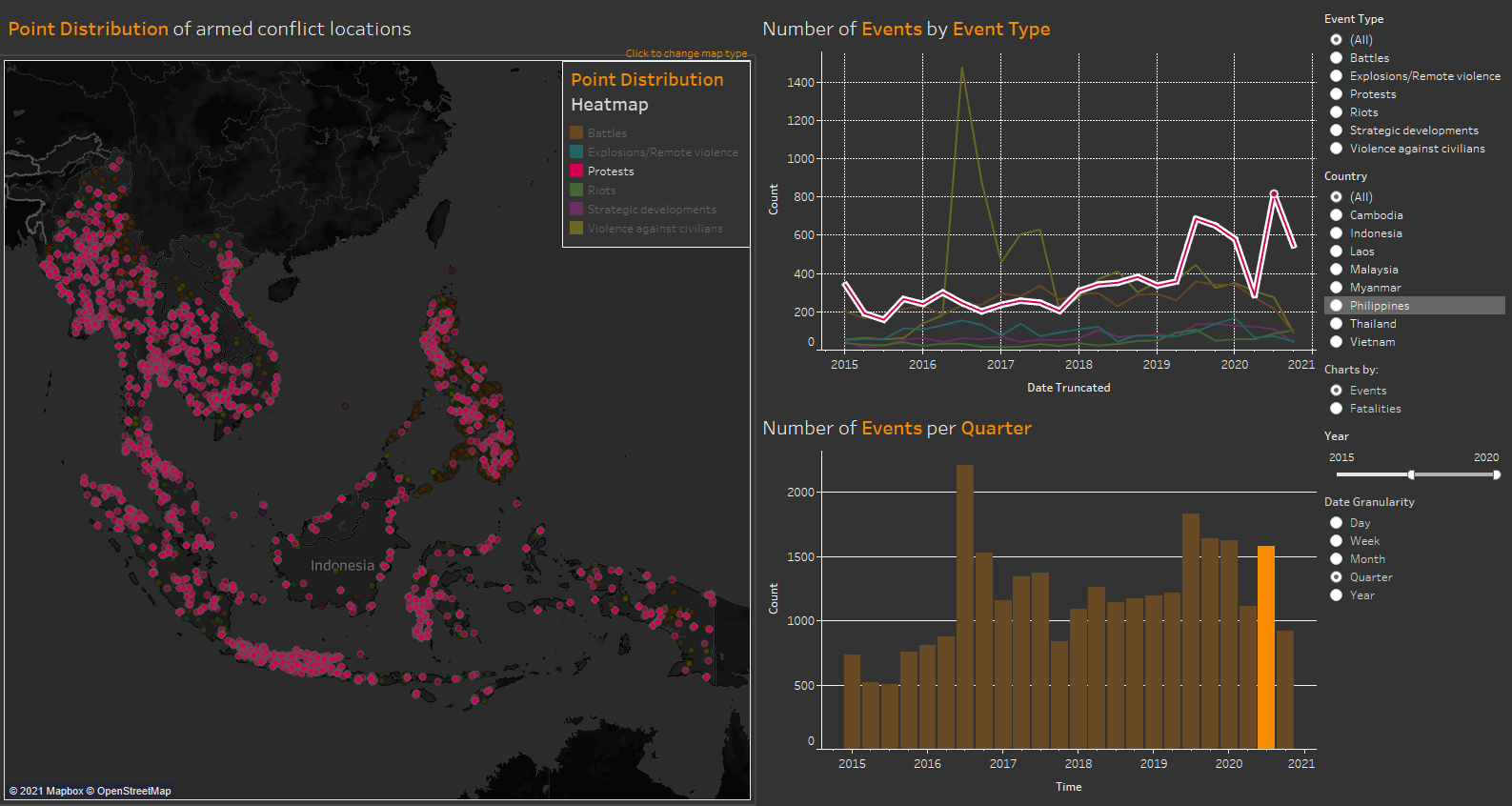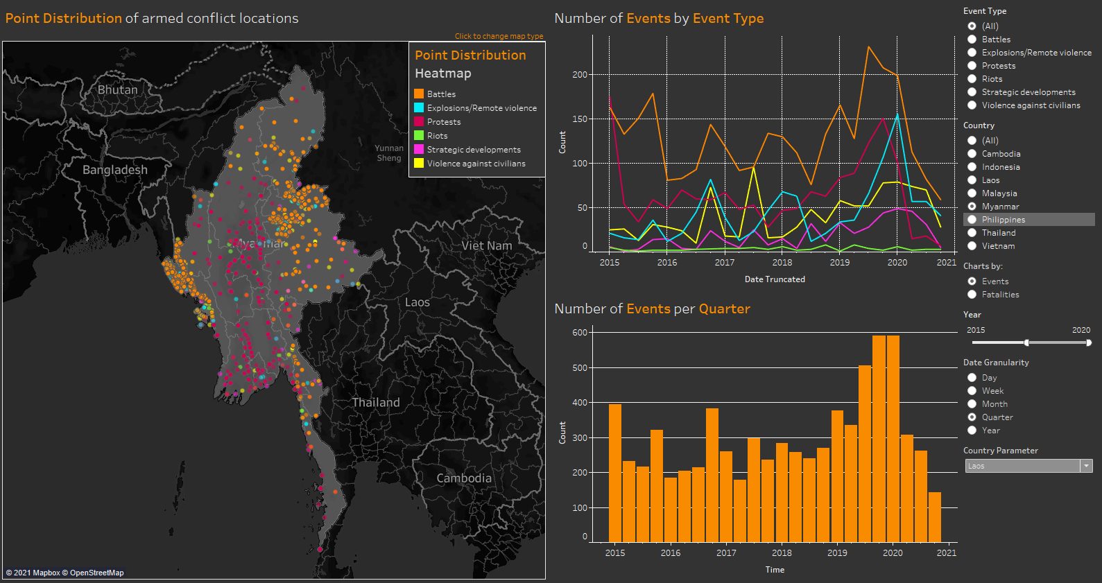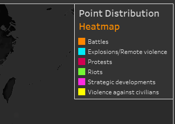 - Because the locations in the dataset are not standardized, the events can only be grouped to the Country level, hence choropleth map is not suitable to represent the data. A better way to visualize the spatial data is by using both a heatmap, for overview of the location and density of the armed conflict events, and a point distribution map for more detailed view of individual events. Users will have the option to switch between the 2 types of map.