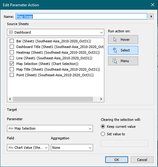 - Remove the Map Selection parameter from the dashboard since we’re going to use a dashboard action to trigger the parameter.