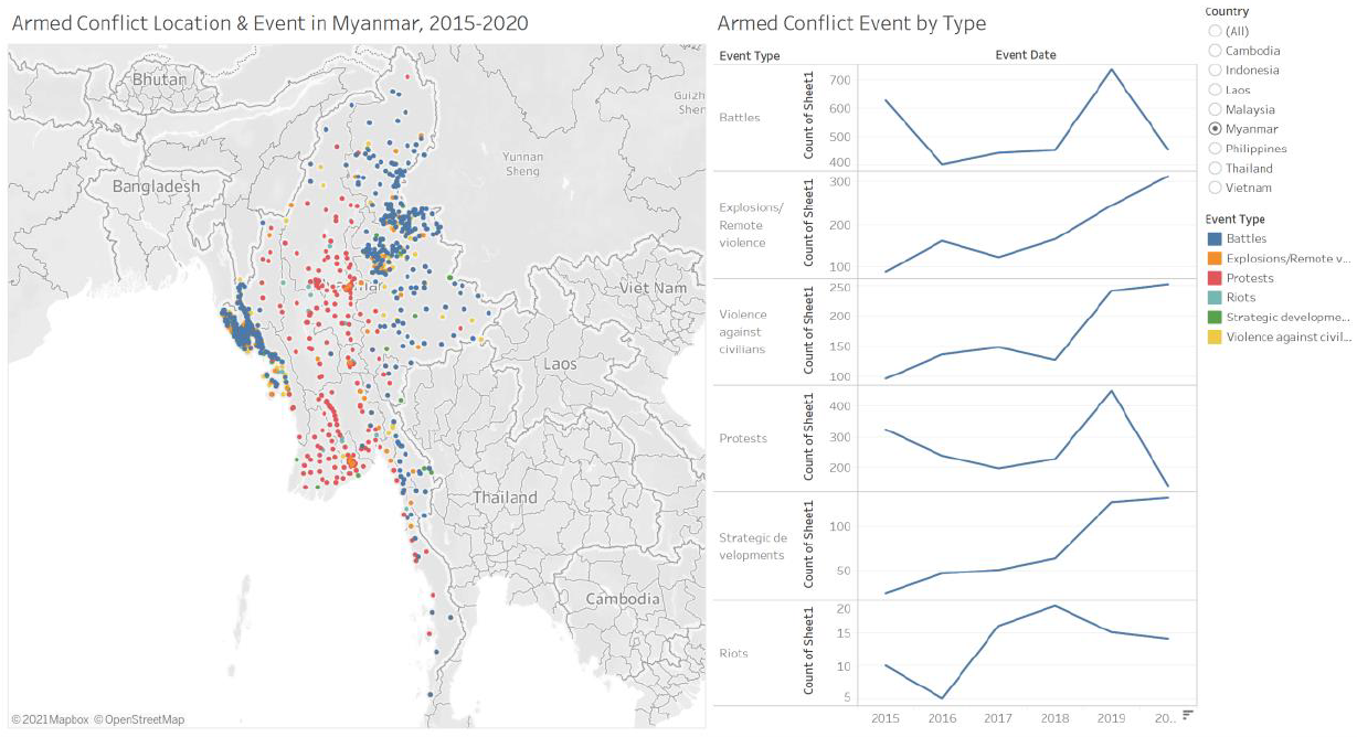 - From 2015 to 2020, the most common armed conflict events in Myanmar are of the “Battles” type, with a larger cluster on the Western coast of the country.