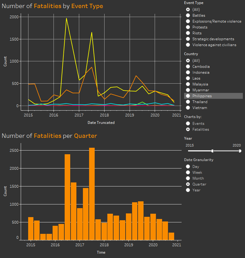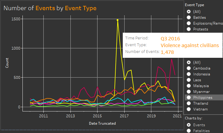 - There is a large spike of events and fatalities during Q3 2016, which is due to the violence against civilians events in Philippines